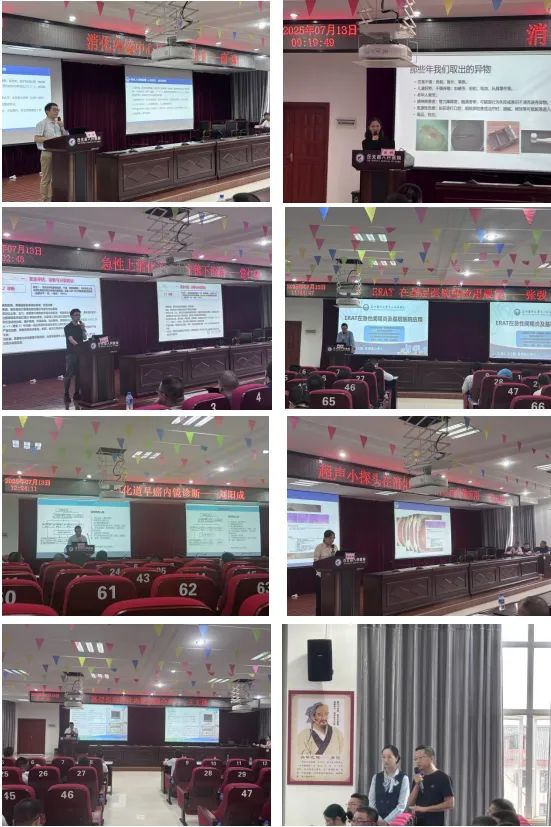 上午的学术讲座在丘北县人民医院3号会议室拉开帷幕,内容丰富且贴合基层实际需求。昆明医科大学第一附属医院南琼教授分享了消化内镜中心质控经验,为基层医院规范内镜中心管理提供了宝贵经验;云南大学附属医院的盛娟教授详细讲解了消化道异物内镜诊治要点,结合临床案例让大家对相关诊疗流程有了更清晰的认识;云南中医药大学第一附属医院常仁杰教授聚焦急性上消化道出血的内镜下诊治,深入剖析了不同出血情况的处理策略;昆明医科大学第一附属医院朱云珍教授介绍了超声小探头在消化系统疾病诊治中的应用,让基层医护人员了解到这一技术在精准诊断中的价值;昆明医科大学第一附属医院张弢教授展望了ERAT在基层医院的应用前景,为基层开展相关技术指明了方向;昆明医科大学第一附属医院刘阳成教授则围绕消化道早癌内镜诊断进行讲解,强调了早发现、早诊断对于提高患者生存率的重要性;最后,丘北县人民医院消化内科王文勇副主任分享了基层医院消化内镜发展的经验,为其他基层医院的学科建设提供了参考。每场讲座后都设有讨论环节,参会的医护人员积极参与,与专家深入交流,现场学术氛围浓厚。
